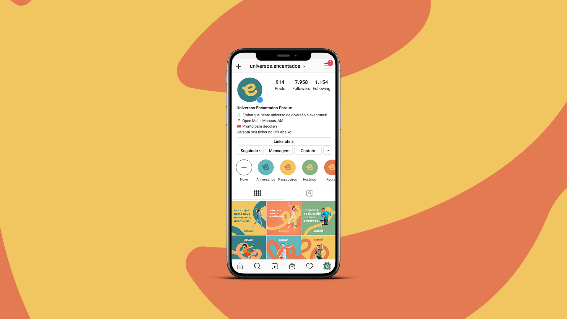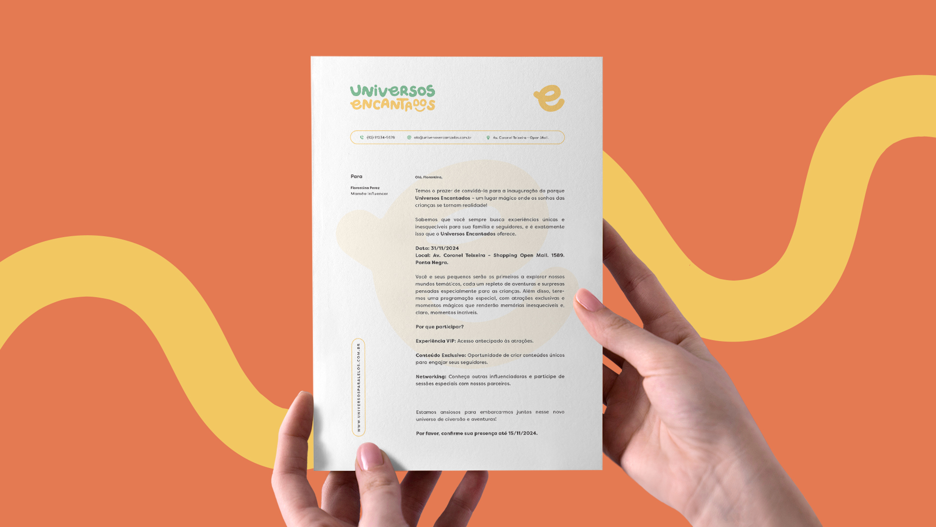 Combinando tipografia orgânica e uma paleta de cores equilibrada, a identidade visual de “Universos Encantados” não apenas reflete o espírito do parque, mas também convida o público a explorar e se divertir. Cada detalhe foi pensado para comunicar a promessa do parque: um lugar onde a imaginação ganha vida e a diversão está garantida.